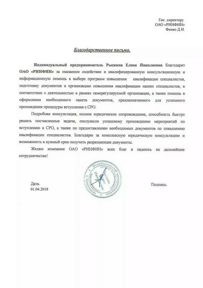 Индивидуальный предприниматель Рыскина Елена Николаевна благодарит АО «РИНФИН» за оказанное содействие и квалифицированную консультационную и информационную помощь в выборе программ повышения квалификации специалистов, подготовку документов и организацию повышения квалификации наших специалистов, в соответствии с деятельностью в рамках саморегулируемой организации, а также помощь в оформлении необходимого пакета документов, предназначенного для успешного прохождения процедуры вступления с СРО.