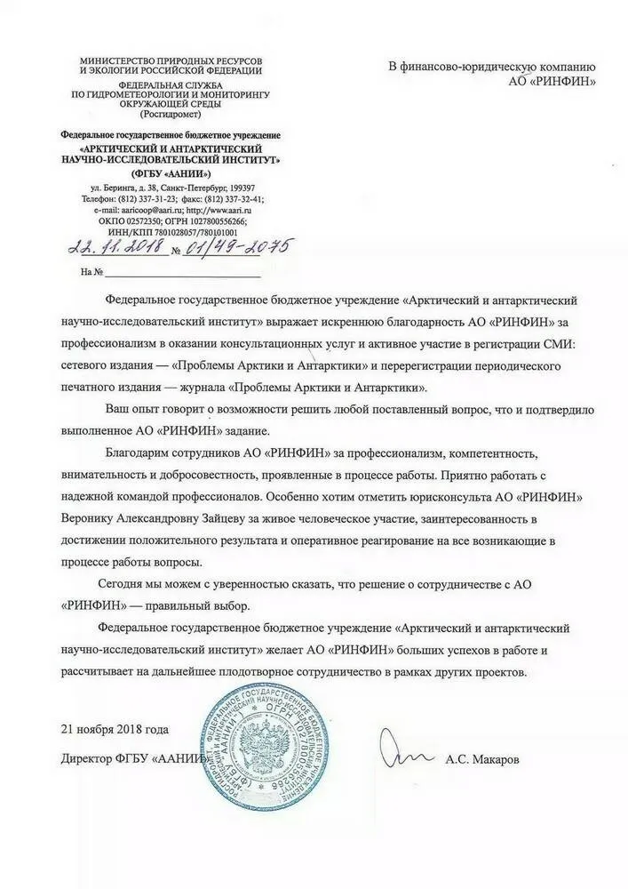 Федеральное государственное бюджетное учреждение «Арктический и антарктический научно-исследовательский институт» желает АО «РИНФИН» больших успехов в работе и рассчитывает на дальнейшее плодотворное сотрудничество в рамках других проектов.