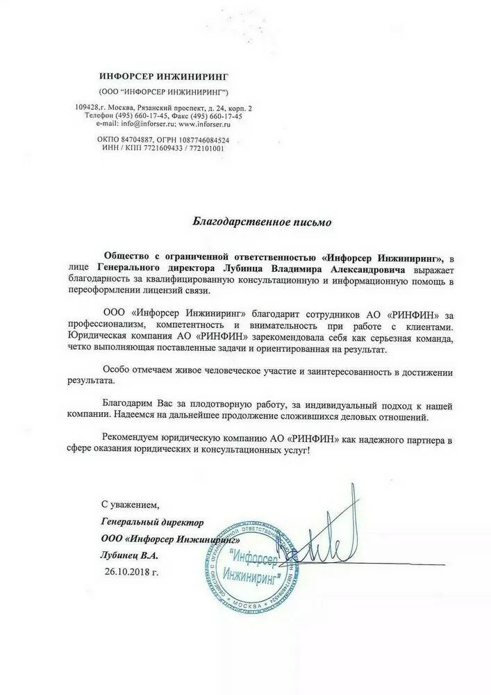В связи с чем благодарим руководство и сотрудников АО «РИНФИН» за профессионализм, компетентность, внимательность и аккуратность при работе с клиентами.