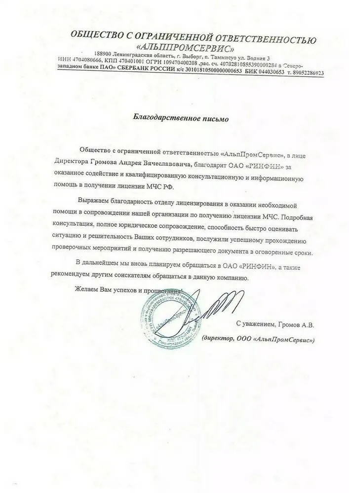 Общество с ограниченной ответственностью «АльпПромСервис», в лице Директора Громова Андрея Вячеславовича, благодарит АО «РИНФИН» за оказанное содействие и квалифицированную консультационную и информационную помощь в получении лицензии МЧС РФ.
