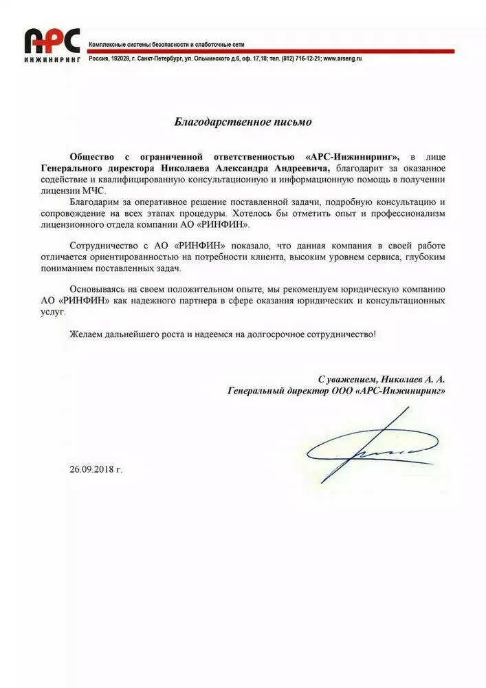 Общество с ограниченной ответственностью «АРС-Инжиниринг», в лице Генерального директора Николаева Александра Андреевича, благодарит за оказанное содействие и квалифицированную консультационную и информационную помощь в получении лицензии МЧС.
