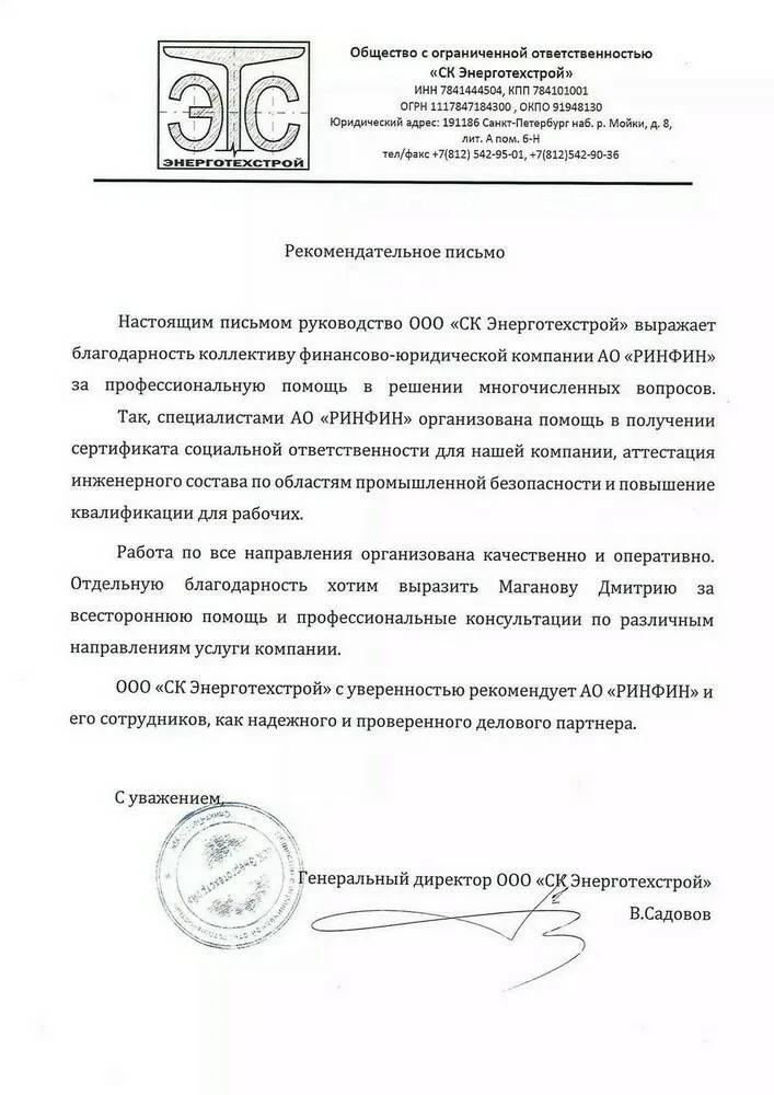 Настоящим письмом ООО «Возрождение» рекомендует компанию АО «РИНФИН», как надежного партнера в сфере информационных, консультационных и юридических услуг.