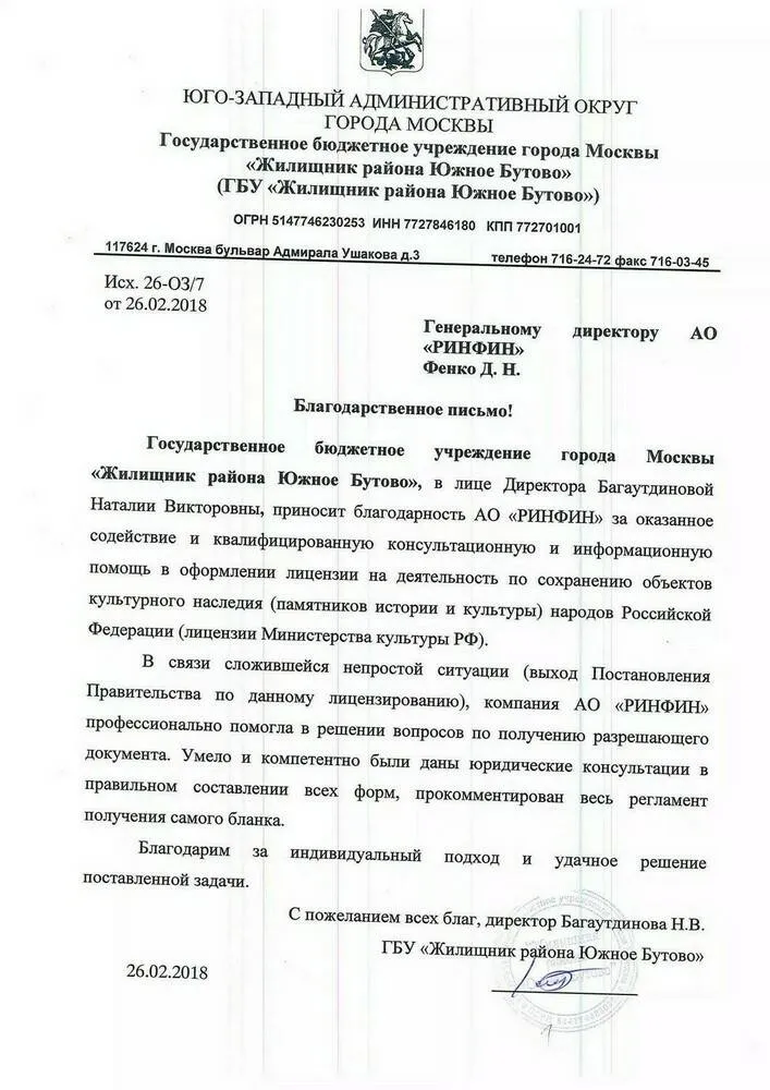 Государственное бюджетное учреждение города Москвы «Жилищник района Южное Бутово», в лице Директора Багаутдиновой Наталии Викторовны, приносит благодарность АО «РИНФИН» за оказанное содействие и квалифицированную консультационную и информационную помощь в оформлении лицензии на деятельность по сохранению объектов культурного наследия (памятников истории и культуры) народов Российской Федерации (лицензии Министерства культуры РФ).