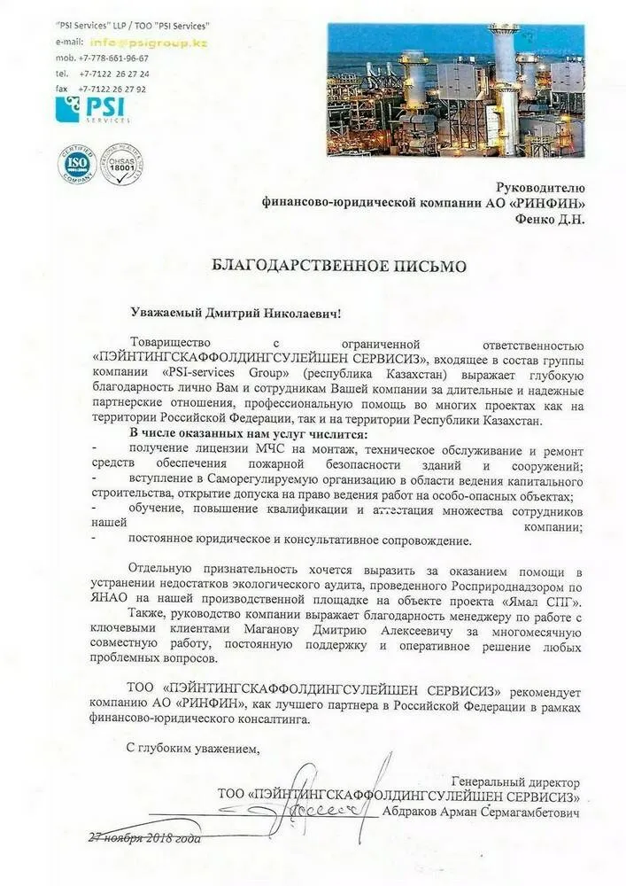 Уважаемый Дмитрий Николаевич! Товарищество с ограниченной ответственностью «ПЭЙНТИНГСКАФФОЛДИНГСУЛЕЙШЕН СЕРВИСИЗ», входящее в состав группы компании «PSI-services Group» (республика Казахстан), выражает глубокую благодарность лично Вам и сотрудникам Вашей компании за длительные и надежные партнерские отношения, профессиональную помощь во многих проектах как на территории Российской Федерации, так и на территории Республики Казахстан.
