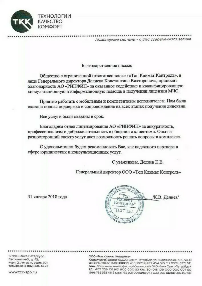 Общество с ограниченной ответственностью «Топ Климат Контроль», в лице Генерального директора Делиева Константина Викторовича, приносит благодарность АО «РИНФИН» за оказанное содействие и квалифицированную консультационную и информационную помощь в получении лицензии МЧС.