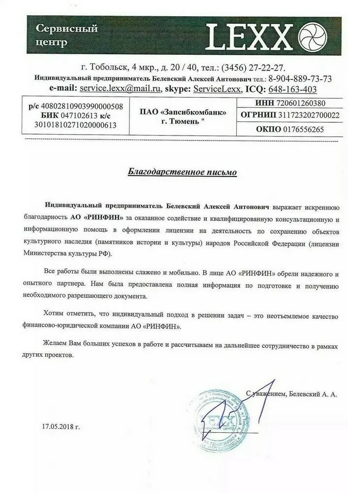 Индивидуальный предприниматель Белевский Алексей Антонович выражает искреннюю благодарность АО «РИНФИН» за оказанное содействие и квалифицированную консультационную и информационную помощь в оформлении лицензии на деятельность по сохранению объектов культурного наследия (памятников истории и культуры) народов Российской Федерации (лицензии Министерства культуры РФ).